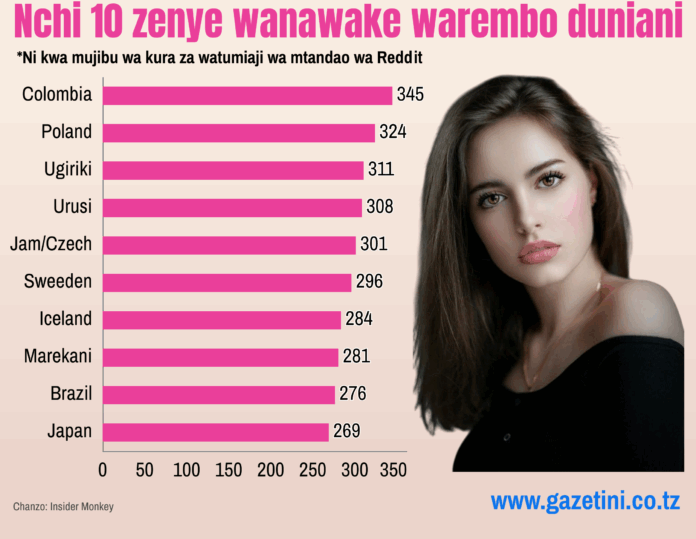 Utafiti uliofanyika kupitia jukwaa la mtandaoni la Reddit na kuhusisha maoni ya watumiaji mbalimbali, umetaja nchi zinazodaiwa kuwa na wanawake warembo zaidi duniani, ukitoa mwanga kuhusu mitazamo ya urembo wa kimataifa kulingana na hisia za wengi.