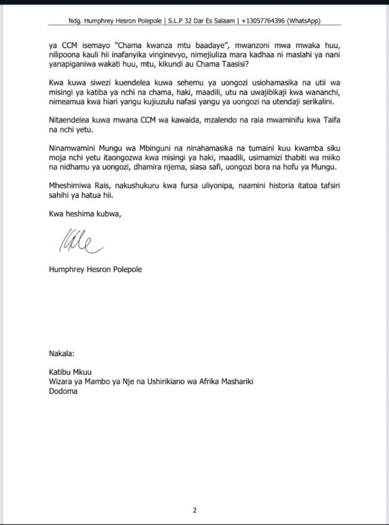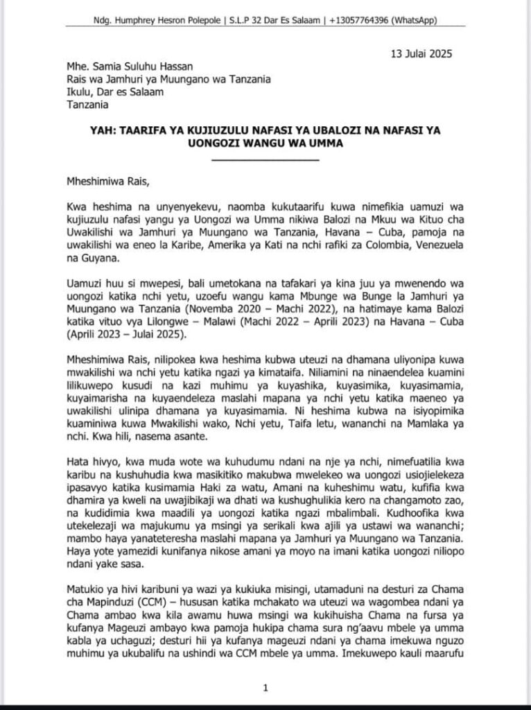 Kupitia barua yake aliyomwandikia Rais wa Jamhuri ya Muungano wa Tanzania, Dk. Samia Suluhu Hassan, leo Julai 13, 2025, Polepole amesema amechukua uamuzi huo kutokana na kukosekana kwa uelekeo sahihi katika uongozi wa kitaifa, kufifia kwa maadili na dhamira ya kuhudumia Wananchi.