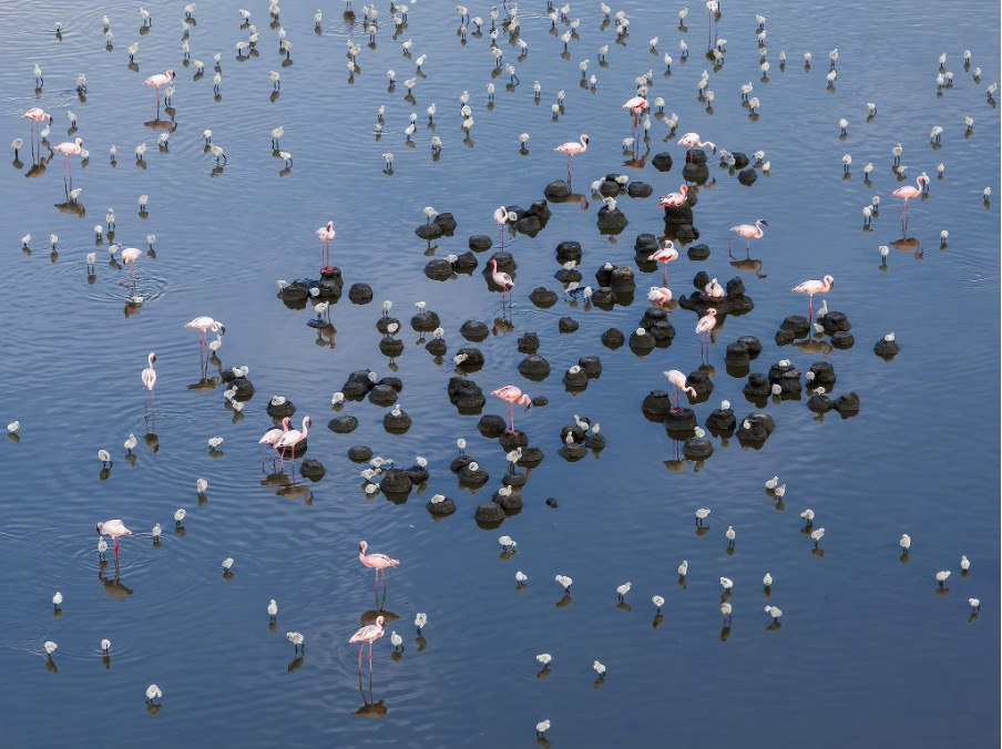 Picha inaonyesha umuhimu mkubwa wa kudumisha usawa wa maji katika Ziwa Natron kwa maisha ya kuzaliana na kulisha ya ndege aina ya flamingo wadogo. Mabadiliko yoyote katika viwango hivi nyeti vya maji au hali maalum za kemikali za ziwa hilo yatasababisha uharibifu usioweza kurekebishwa wa eneo hili kuu la kuzaliana, ambalo ni muhimu kwa idadi ya flamingo wadogo duniani kote.