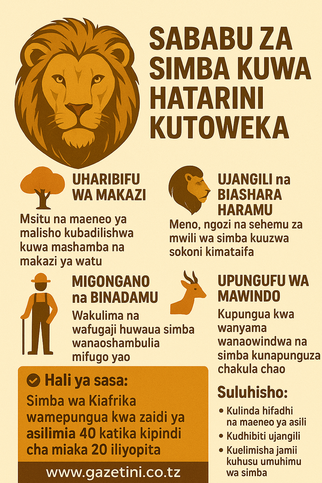 Katika maadhimisho ya Siku ya Simba Duniani, taarifa mpya zinaonyesha hali ya kutisha kwani Simba, miongoni mwa wanyama mashuhuri barani Afrika, tayari wametoweka katika nchi 26 kati ya 48 zenye wanyama hao Afrika, na sasa wanapatikana katika asilimia 7 pekee ya maeneo yao ya asili.