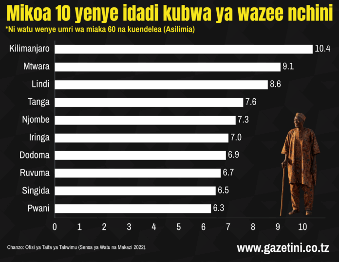 KULINGANA na takwimu za Sensa ya Watu na Makazi ya mwaka 2022 zilizotolewa na Ofisi ya Taifa ya Takwimu (NBS), imebaini kuwa mkoa wa Kilimanjaro unaongoza nchini kwa kuwa na idadi kubwa zaidi ya wazee wenye umri wa miaka 60 na kuendelea, wakifikia asilimia 10.4 ya wakazi wake.