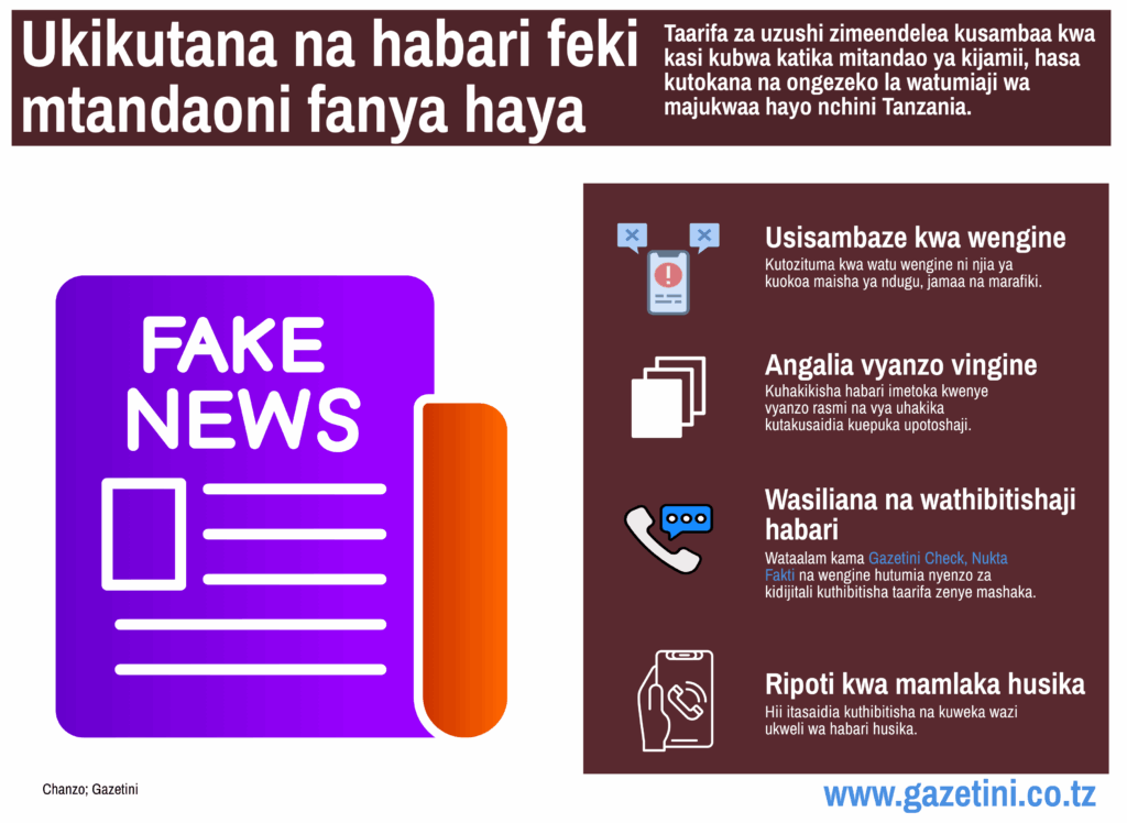 Pia ni muhimu kuripoti taarifa hizo kwa mamlaka husika ili ukweli uweze kubainishwa wazi. Vilevile, unaweza kuwasiliana na wathibitishaji habari kama Nukta Fakti ambao hutumia teknolojia na nyenzo za kidijitali kuthibitisha usahihi wa taarifa. Hatimaye, angalia vyanzo vingine vya habari ili kuhakikisha taarifa umetumia imetoka kwenye chanzo rasmi na cha kuaminika.