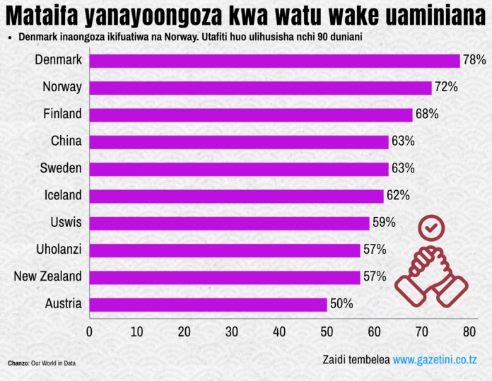 NI kwa mujibu wa utafiti uliofanywa mwaka 2022 na kuchapishwa mwaka 2024, ukionesha kuwa Denmark, Norway, Finland, Sweden na Iceland ndiyo mataifa yanayoongoza kwa watu wake kuaminiana.