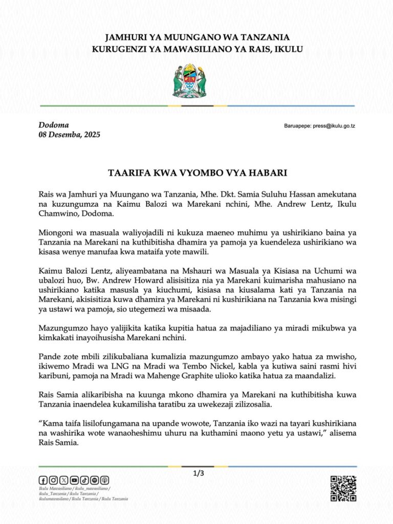 Mazungumzo hayo  yamefanyika leo Desema 8, 2025, Ikulu Chamwino, mkoani Dodoma ambapo   pande zote mbili zimeeleza nia ya kuimarisha na kupanua ushirikiano kati ya mataifa hayo mawili.