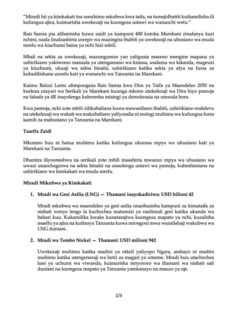 Rais Samia amesisitiza umuhimu wa kuendeleza miradi ya maendeleo inayolenga kuinua uchumi wa wananchi na kuongeza fursa za ajira, huku Balozi Lentz akionyesha msukumo wa Marekani katika kushirikiana na Tanzania kwenye sekta mbalimbali za maendeleo.