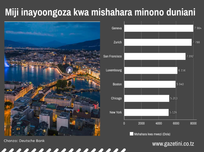 Miji mingine ambayo wafanyakazi wanafurahia mishahara mikubwa zaidi ni Luxembourg (Dola 6,156), Boston (Dola 5,940), Chicago (Dola 5,203) na New York (Dola 5,128).