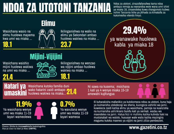 NDOA za utotoni, zinazofafanuliwa kama ndoa inayohusisha mmoja au wote wawili walio chini ya umri wa miaka 18, bado ni tatizo kubwa nchini Tanzania licha ya juhudi za kimataifa za kukomesha vitendo hivyo.
