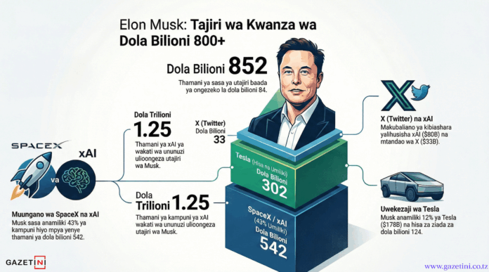 Bilionea maarufu duniani, Elon Musk, ameweka historia mpya baada ya kuwa mtu wa kwanza kumiliki utajiri unaozidi dola bilioni 800, kufuatia hatua ya kampuni yake ya kutengeneza roketi, SpaceX, kununua kampuni ya akili mnemba (AI) ya xAI.